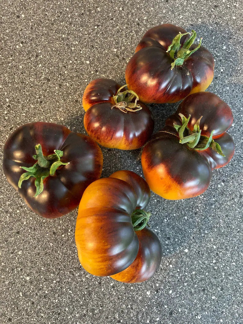100-250g fruit, beefsteaks. This is a red/yellow interior sister of Blue Beauty. Firstly they ripen yellow, then more of an orange when very ripe. Very attractive with the black anthocyanin splashes to the shoulders really contrasting with the lighter coloured skin. Good to very good production. Mid-mid/late. Flavour is very good, much like a good bicolour. Sweet with fruity tones. Very meaty flesh with very few Seeds. One of the best varieties for heat tolerance with good cracking resistance. Very good ability to stay ripe on the vine and stay edible. (sometimes getting better) Excellent post-harvest storage ability. This is an amazing variety. Like all anthocyanin tomatoes, the more direct, unobscured light received, the darker the shoulder splashes.